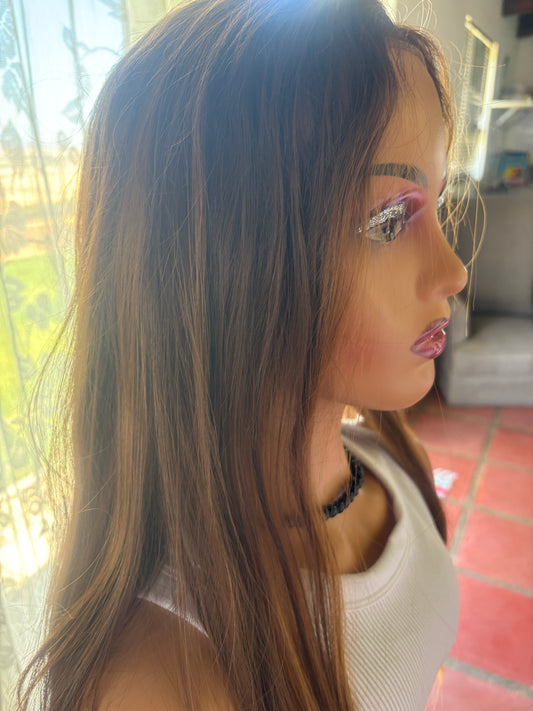 16 Inch Glueless Brown Honey Blonde Blended Human Hair Wig – 200% Density (5×5 Lace)